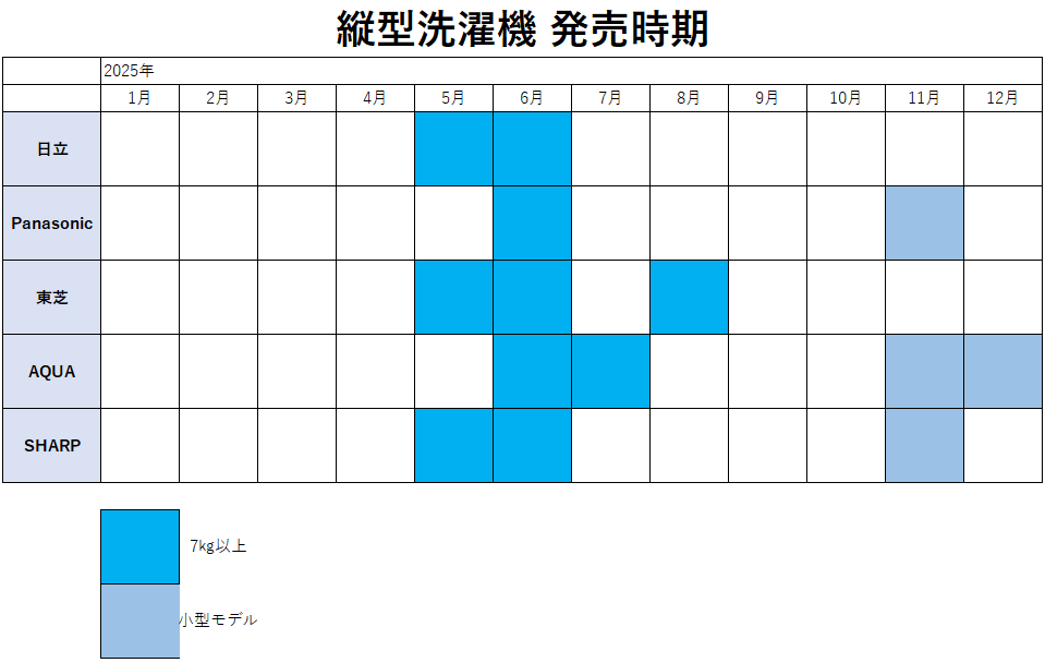 縦型洗濯機の2025年モデルは、5月~6月にかけて発売されたものが多いです。