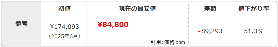 すでに半額以下まで値下がりして8万円以上安くなっているモデルもあります。