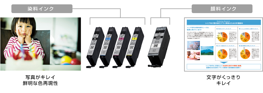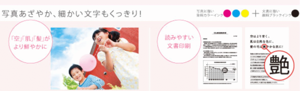 写真に強い染料インクと、にじみにくい顔料インクで、黒が2つ入っているのも特徴です。